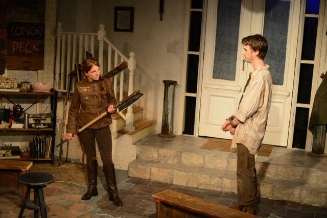 Blast Radius and Sovereign both take place post-invasion. We come to understand that all technology and remnants of modern society have been purged from the world by the aliens, but our view remains cunningly restricted to Sandy Yalkin’s terrific set of the ever-evolving Cooke family living room throughout. Blast Radius is set twelve years after Advance Man, when the Cooke house has been rejiggered to serve as a human “birthing house.” The conquering aliens – who now centralize their collective intelligence in “honeycombs” throughout the world – depend on mankind for slave labor. Only pregnant women are given a reprieve, and mostly because our messy mammalian live births give the big bugs the screaming heebie jeebies. With her visionary father long dead and her mother drifting into senility, Ronnie has concocted a plan to take the planet back from the bugs by destroying the nearby honeycomb. Knowing that the birthing house is the one place the bugs will never dare go, she manages to stay pregnant and thus is able to lead an insurgency from the place that was her childhood home. Her brother Abbie has sided with the aliens as an ambassador, even taking Connor, an alien who telepathically overrode the mind a human, as his lover. Abbie believes that overriding the minds of every human on Earth, including his own, and putting them under the control of the honeycomb will simplify things. In Advance Man, we saw two sides of adolescence via Ronnie and Abbie and now we see two sides of an unthinkable war, where each of them must make sacrifices to survive.