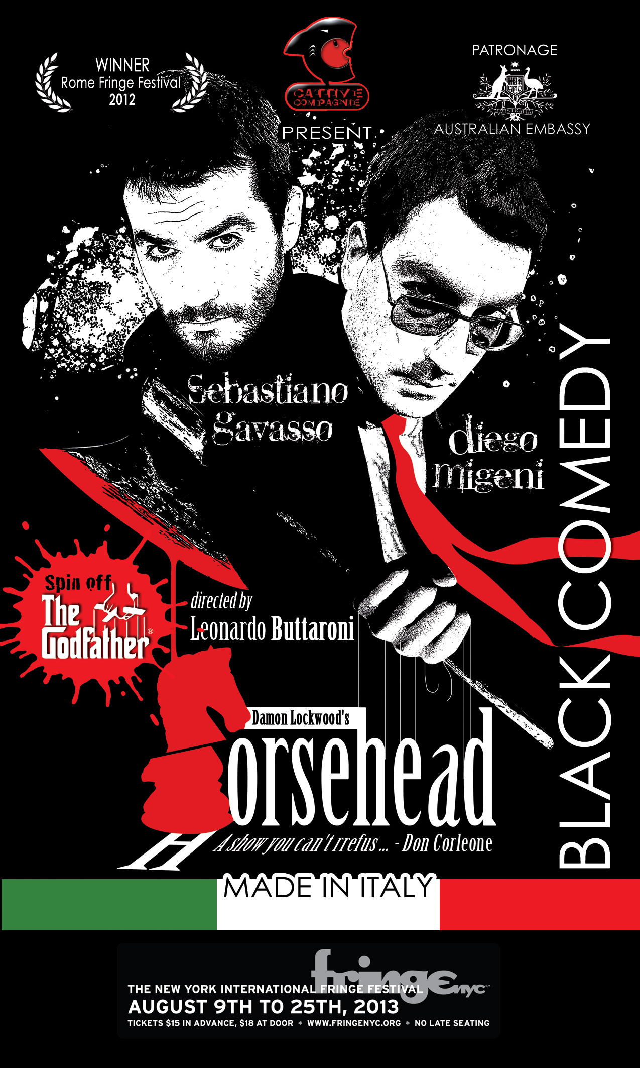 It’s a testament to Coppola’s masterful filmmaking that in this scene, when Hollywood hotshot Jack Woltz wakes up in his bed with the severed head of his prized stallion, the horror is so invasive and so telling of the reach of Don Corleone that no one ever gives a second thought to how precisely that head might have gotten there.  Well, most people don’t.  Playwright Damon Lockwood and the crafty members of the Italian theater company Catttiva Compagnie, on the other hand, submit the zippy New York Fringe offering Horsehead as a possible explanation.  We meet two lowlife brothers named Fillipo and Edmundo who have agreed to perform the gruesome equine decapitation and delivery.  This is Phil and Ed’s big opportunity to get in good with “the family,” but at the last minute they start get cold feet about accepting the proverbial “offer they couldn’t refuse.”  Horsehead won top honors at the Fringe Festival in Rome last year, and deservedly so – it’s a brisk, highly entertaining comedy that cleverly illuminates one of the more infamous scenes in cinema history.