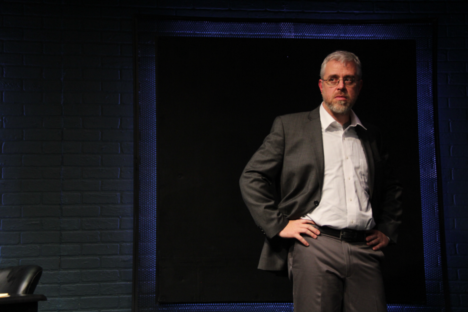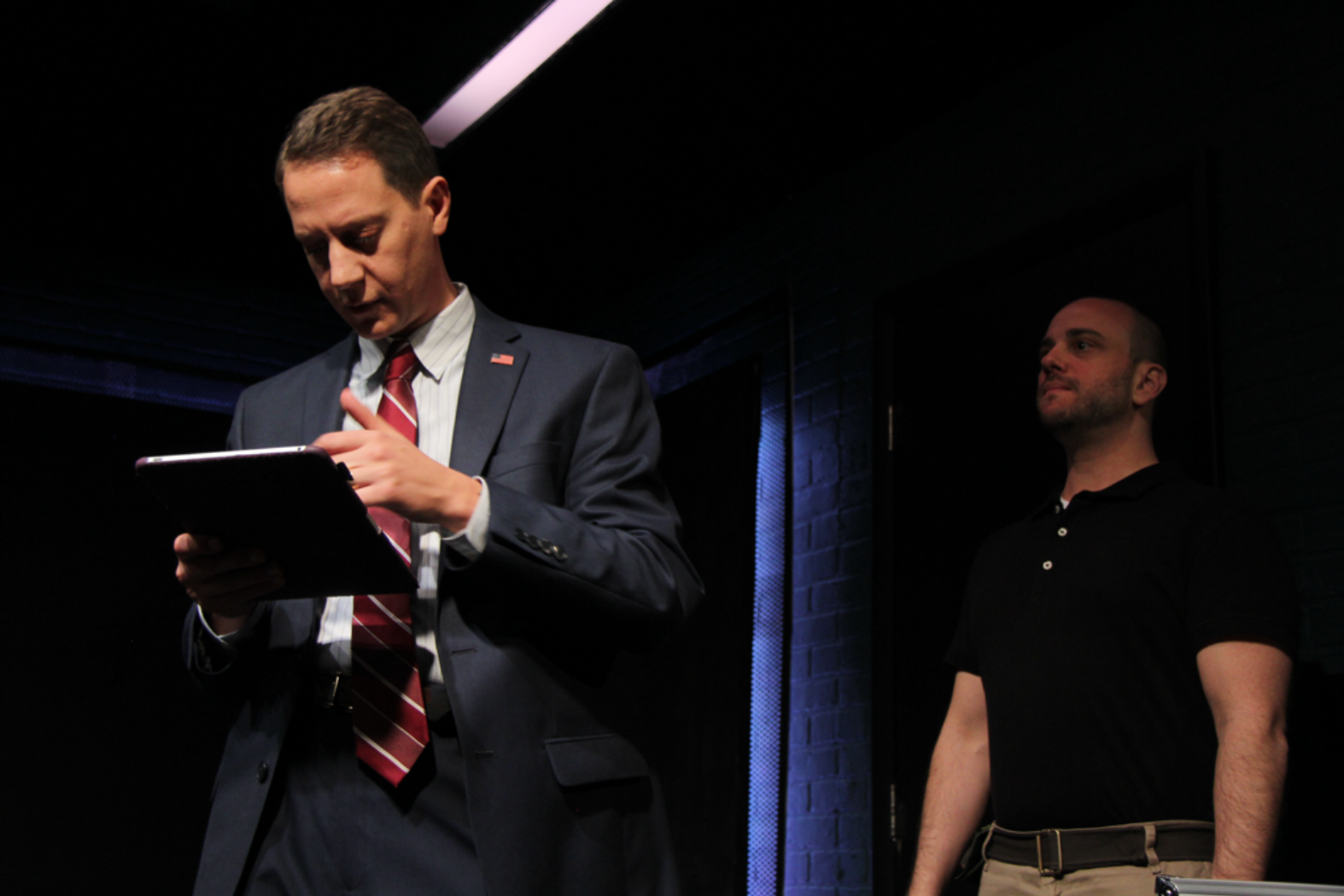 The drone and the leak originate from a subset of the CIA referred to in the play as the “Fifth Floor,” where the rubber meets the road in terms of surveillance and wet works. The branch was founded by Josh Ruskin (Sean Williams), a Clinton era spymaster who has come on hard times. In the wake of his divorce Ruskin’s depression and drinking led to his being excused from the Agency in disgrace. Now he has been dragged to an offsite Fifth Floor facility at 2am by Zach (Seth Shelden), one of his old subordinates who is currently running the show. Zach and his unhinged interrogator, Ford (Rob Maitner), are having no luck getting information about Icarus from the mole; they are hoping that the once legendary Josh Ruskin can work his magic in the precious few hours they have before the top secret blueprints show up on the black market. They are inclined to think Ruskin can do this because the mole is a notoriously thorough and lethal spy named Sunny Black (Kate Middleton), who also happens to be his ex-wife.