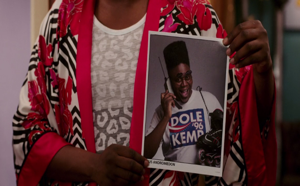 But the theme song concept fits with the series – Kimmy Schmidt excels in fully committing to jokes that are protracted or have very deep concepts. Just one example would be Kimmy’s roommate Titus, played by Tituss Burgess. Titus is an actor, and at one point he mentions that he needs new headshots because his old ones are dated. I have a lot of actor friends, so I know that this is a real thing. If you grow a beard or get a haircut, you need to get a new headshot. So, Titus makes this remark about his headshot and casually holds it up. In it, he’s wearing a “Dole/Kemp” shirt from the 1996 presidential election, flip-up sunglasses, and a Kid ‘n Play style flattop, while talking on an old-school cell phone and holding a pair of roller blades.