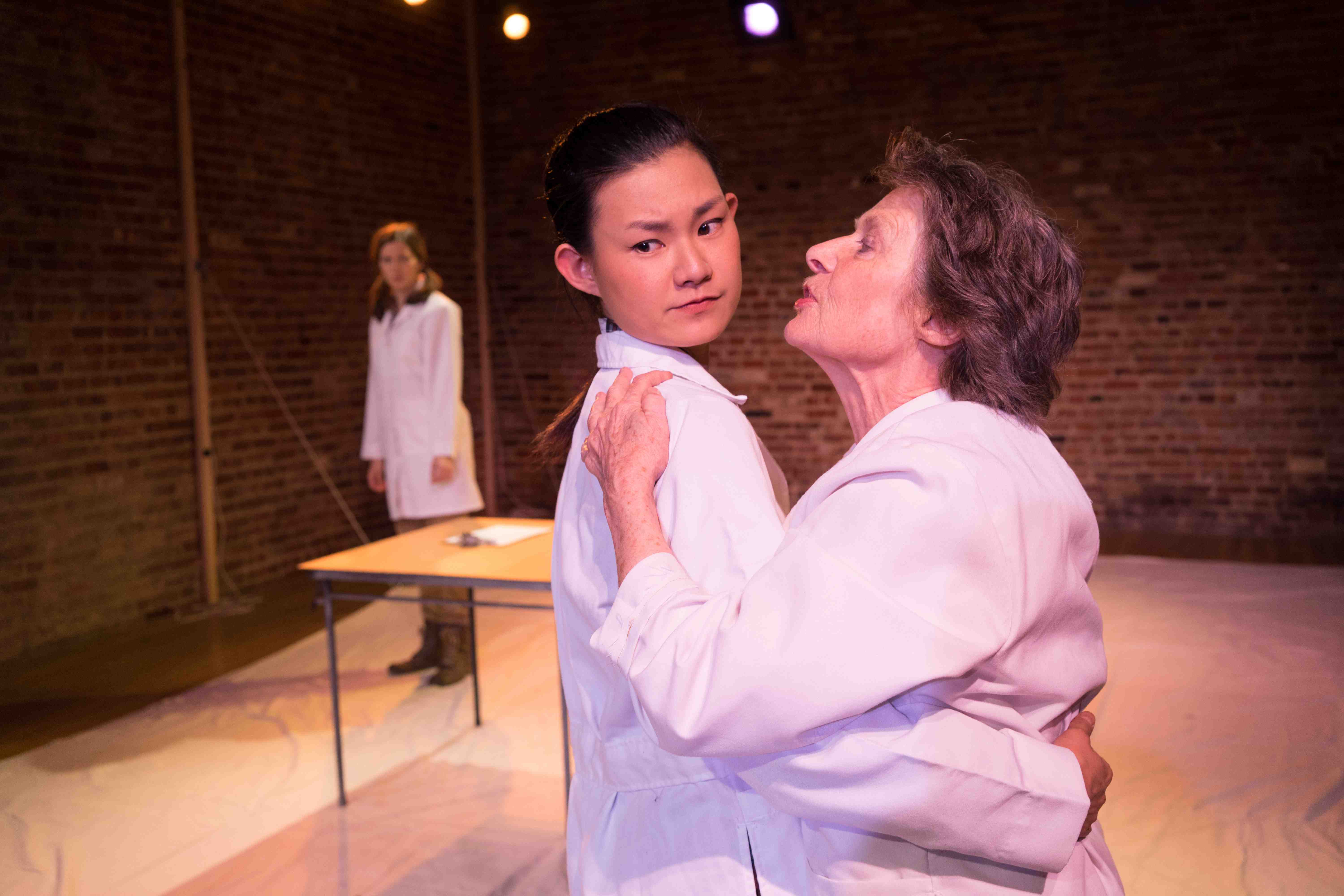 All of the play’s scenes are fractured and full of narrative whimsy, which is not always easy to play. Ms. Mallon, Ms. Busby, Ms. Shepard, and Ms. Lee are all tremendous throughout, as is Michael McKim, who eventually plays the hunter. At one point the scientist played by Lee (identified in the script as “Shadow”) uses a blow-dryer to thaw a frozen mammoth tusk. Rather than have the dryer work practically or add a sound cue, Lee simply makes the “hrrrrrrrrrrrrrrrrrrrrrrm” noise for it. When it is her turn to speak, she signals to the Beloved, who takes over making the noise.