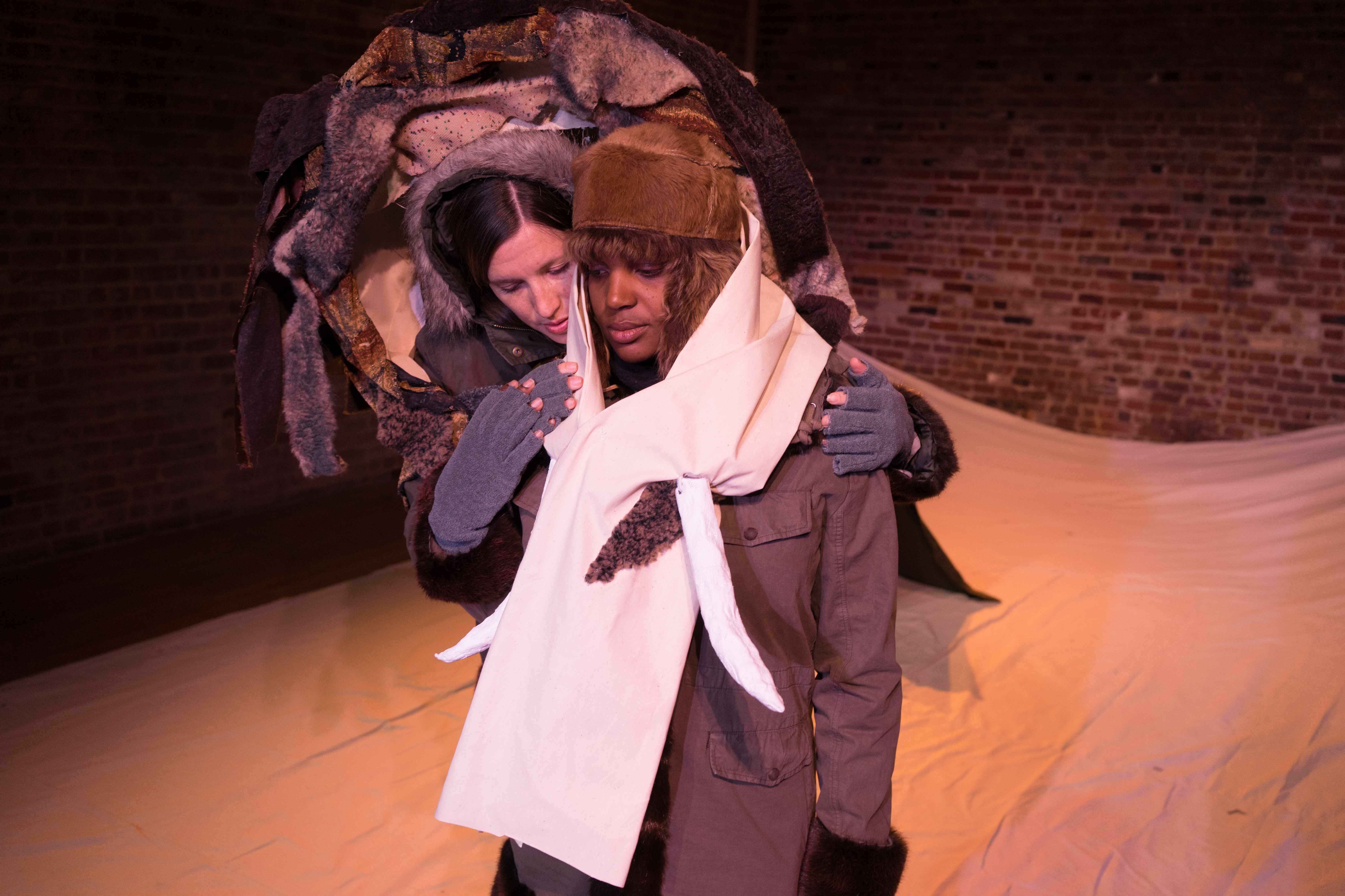 Written and co-directed by Buran Artistic Director Adam R. Burnett, Mammoth is emphatically more mellow than previous Buran work, but it is just as elliptical. Okay, maybe its roughly sketched narratives are a little more defined than the frenetic doodles found in The House of Fitzcarraldo or Magic Bullets, but on balance they are only intended to be gesture drawings of a part of the human emotional experience. The play opens on a tundra, which is nicely evoked by scenic and lighting designer Nicholas Kostner’s inventive use of a large white piece of fabric. We are introduced to characters called “Beloved,” played by Erin Mallon (who is listed in the program as a co-creator), and “Lover,” played by Starr Busby. They have both been out on this ice for a long time digging for mammoth tusks.