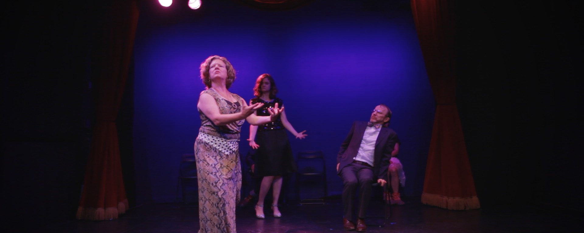 The title Poshlost Saudades! (PS!), according to the program, mashes up a Russian term “poshlost,” coined by Vladimir Nabokov to describe insultingly dumb art, and the Portuguese word “saudades,” which means “a longing for what was and can never be.” This collision between formal critique and wistful exploration, and the resulting dissonance, is a hallmark of Burnett and Buran’s work. And while the narrative here is decidedly more linear than previous outings, the conceit that the evening is being filmed has allowed Burnett to still carve the play up into somewhat disassociated segments, when one or two characters are interviewed or singing for the camera.
